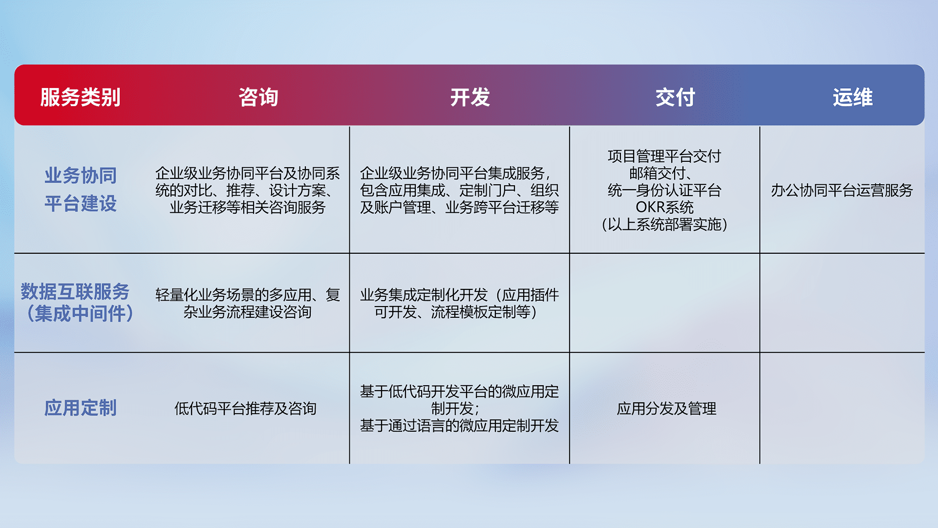 针对钉钉、、、、企微、、、、IDaas等平台级产品提供产品的规划、、、方案、、交付、、、定制化开发等服务,,,实现如统一协同办公、、、、智能客户服务、、混合会议管理、、、智能数据查询、、、、等业务场景,,,,实现数字化转型。。。