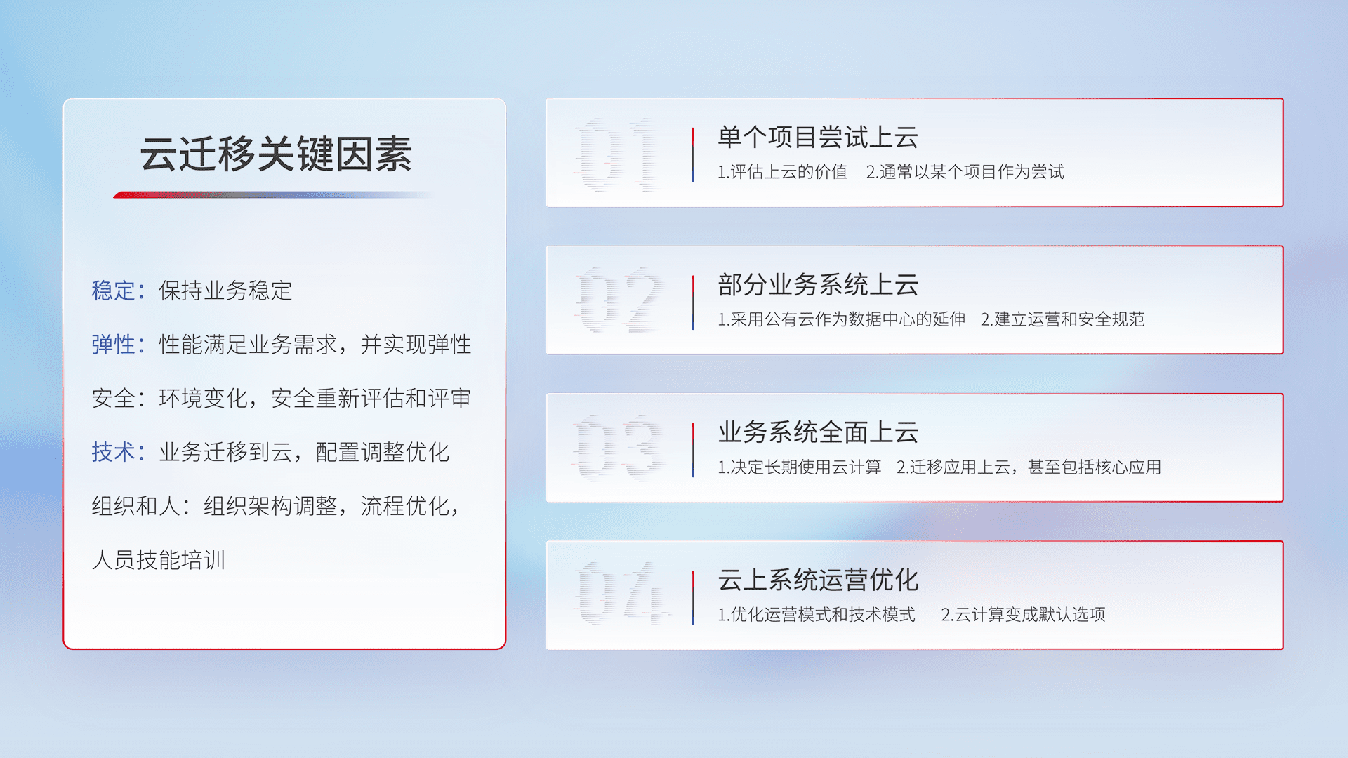 结合实际业务,,从规划设计、、、、云平台选型、、、云原生改造、、数据迁移、、、、集成交付,,,,迁移全过程为客户识别最佳上云路径,,做好风险识别管理,,,设计网络架构、、、身份权限、、、安全审计合规、、、操作审计、、日志审计、、监控告警策略、、、、多站点容灾设计等,,对云上基础设施进行整体规划,,,,提升IT治理水平,,,,以满足弹性、、高可用、、高性能的需求。。。。