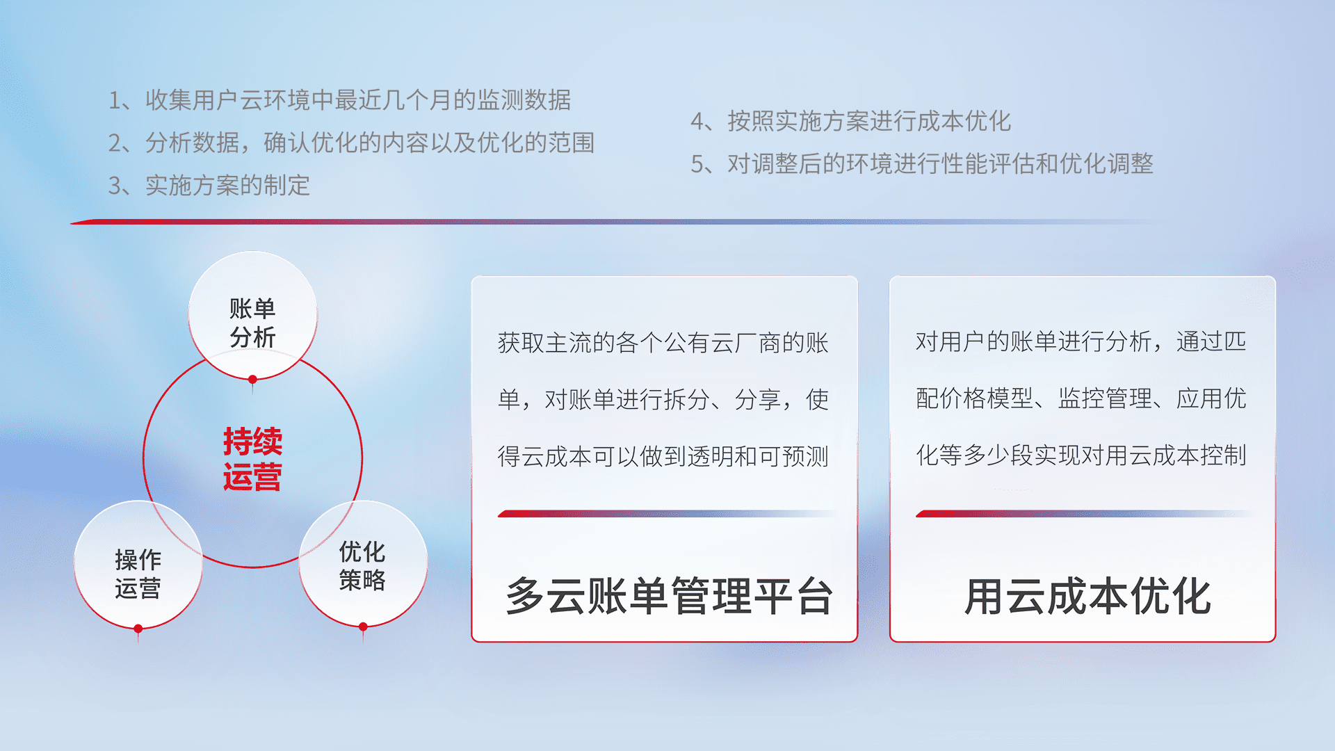 通过多云纳管,,,以统一的资源数据模型把客户的云资源进行抽象和封装,,,,进而实现对多云资源的统一操作,,保障云资源管理的可靠性、、稳定性与可用性。。。量身定制化运维内容,,配置、、、开发运维、、补丁管理、、备份、、、监控、、认证和访问管理、、、、审计和日常巡检等,,,保障在用云过程中的可靠度,,稳定度以及高可用率。。。。